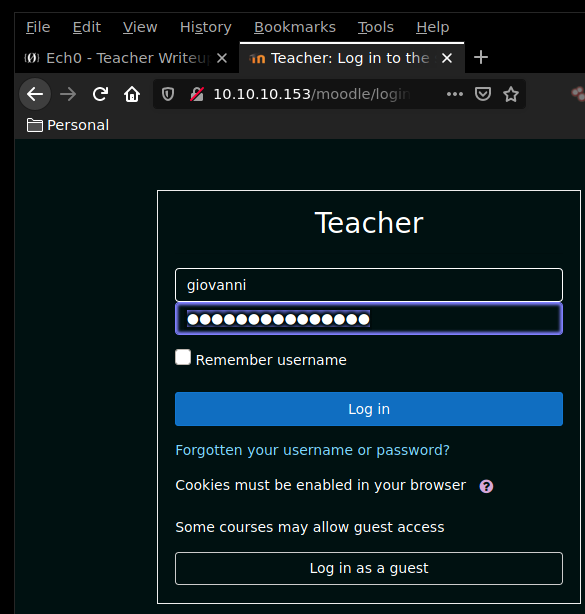Navigating onto the moodle login page, we are greeted with a login form onto which we'll try our credentials for the user giovanni.