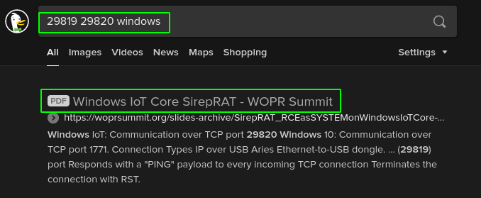 And now we're onto something! This may be a Windows IOT machine, and the presentationthat was presented in 2019 goes into how the Sirep protocol works, which also shows how it provides a remote unauthenticated execution of SYSTEM on windows IOT hosts.