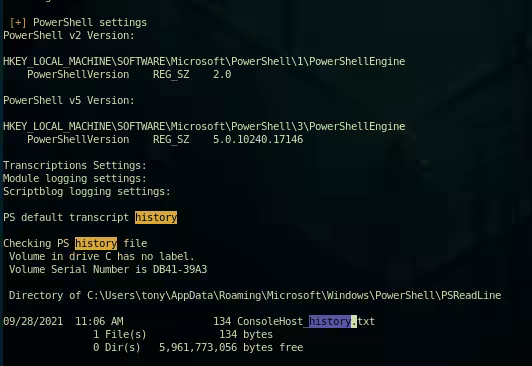 Let it run, then we get a hint towards the ConsoleHost_history text file: