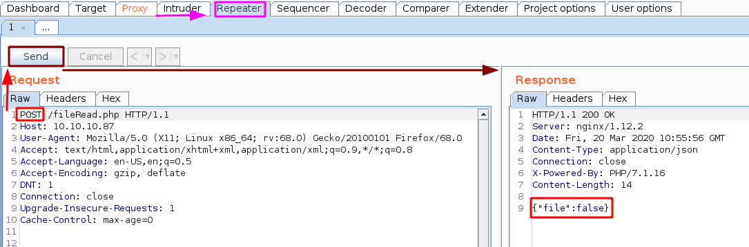 Intercept our GET request aimed at /fileRead.php and send it to burpsuite's Repeater (CTRL+R) and go there (CTRL+SHIFT+R)