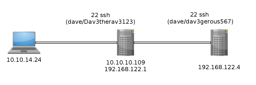This will allow us to use our localhost (127.0.0.1)'s 1234 port to access our final destination(192.168.5.2)'s 987 port from our current machine (192.168.122.4)'s 53 port. To which we will ssh using the same credentials as we used for 192.168.122.4 (dave/dav3gerous567) :