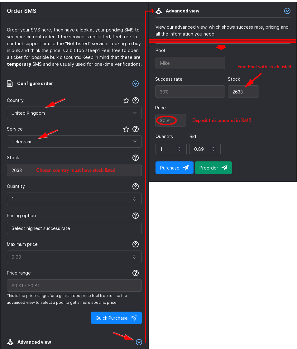 We will need to get a sense of prices to know how much this is going to cost. On the left sidebar, click on Order and select your desired country and service. We'll go with a United Kingdom phone number for Telegram. Scroll down and click on Advanced view to see more detailed information. Scroll down some more and find a Pool that has stock listed. In this case, the Mike Pool has plenty of stock and a listed price of $0.81. We will need to deposit this amount of XMR into our account. Note: the listed success rate is not very reliable and while 30% may seem low, there is actually no penalty for failed attempts since orders purchased that do not receive an SMS in the allotted timeframe are automatically refunded.