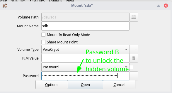 Once in live mode on the Host OS, we open the veracrypt hidden volume: