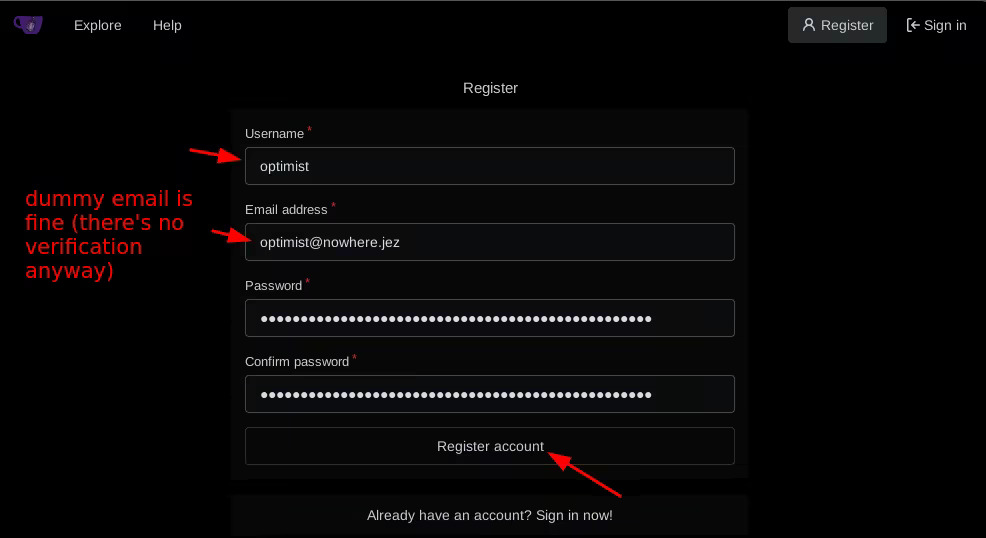 Now you first need to sign up on forgejo, click the Register button and fill out your details.