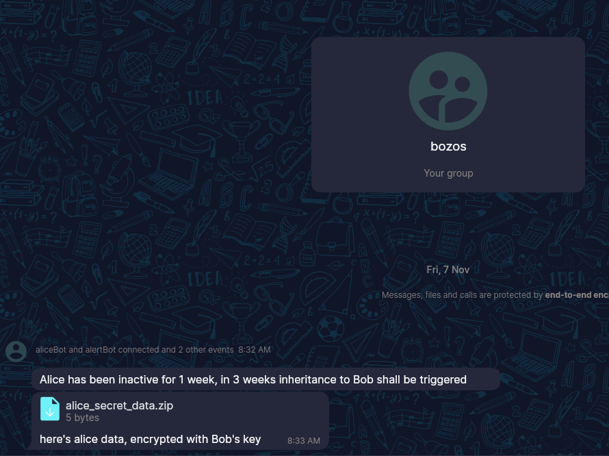 alert_message: "Alice has been offline for a week, inheritance will happen if she remains offline for 3 weeks"