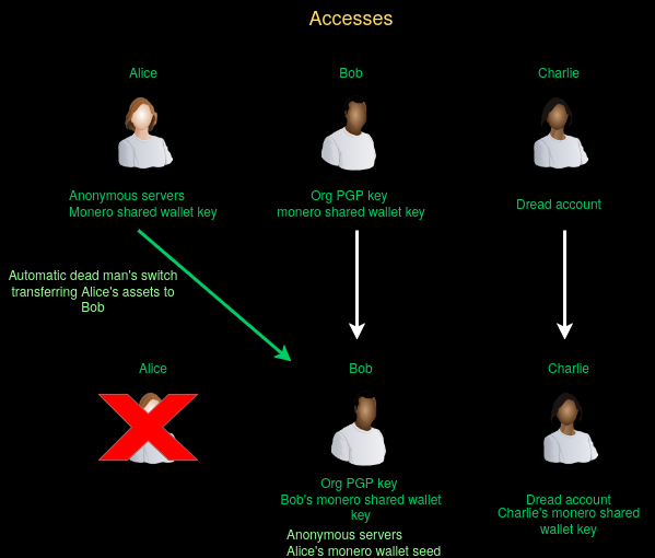 then, if they get compromised or captured the remaining members can keep the organization running, because the dead man's swwitch will ensure that the critical accesses of the compromised member get forwarded to the member chosen to replace them, their heir.