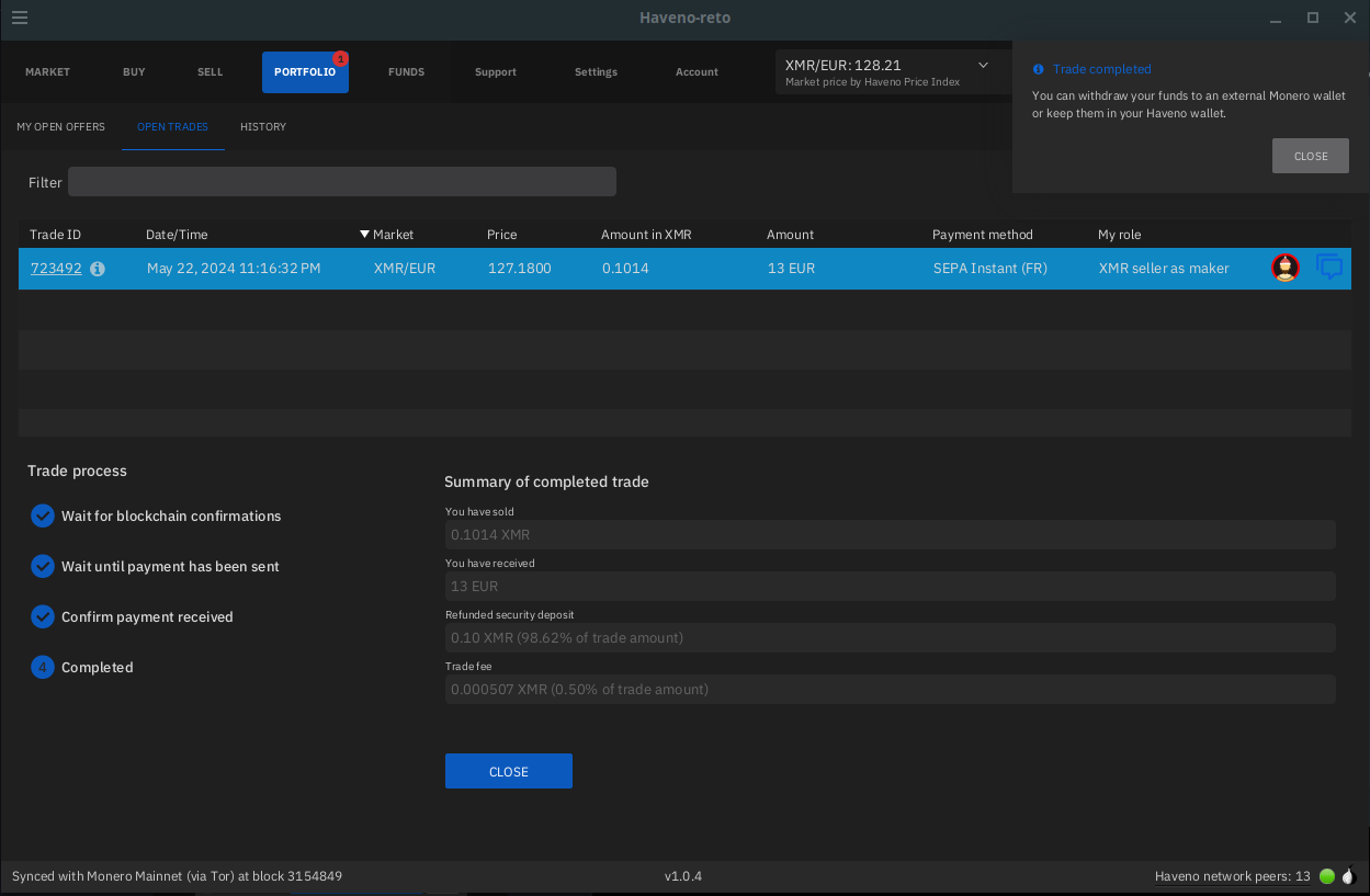 Haveno DEX Bank Transfer (ex: SEPA) -> XMR transaction