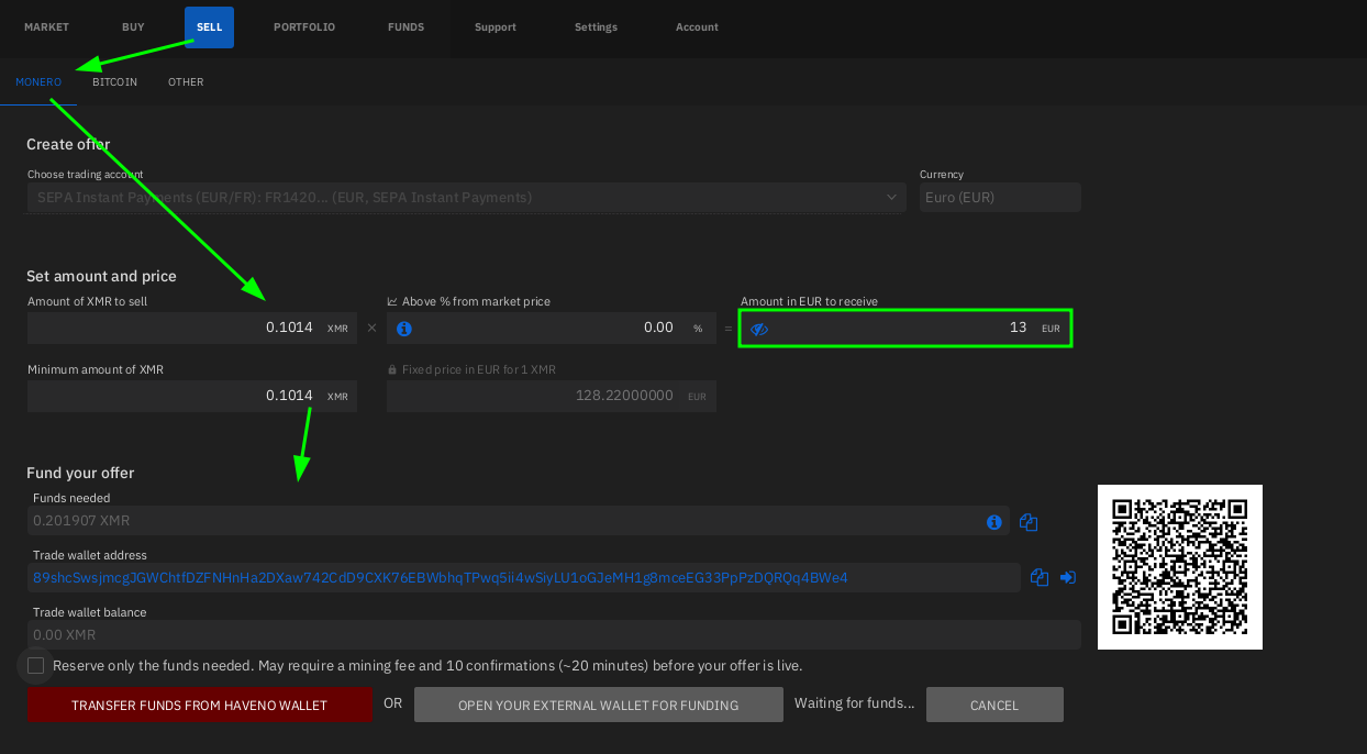 Here Alice wants to sell 0.1014 XMR at current market price (which amounts to 13 euros) , and to fund her offer in total she needs to put in 0.201907 XMR as it includes her side of the security deposit.