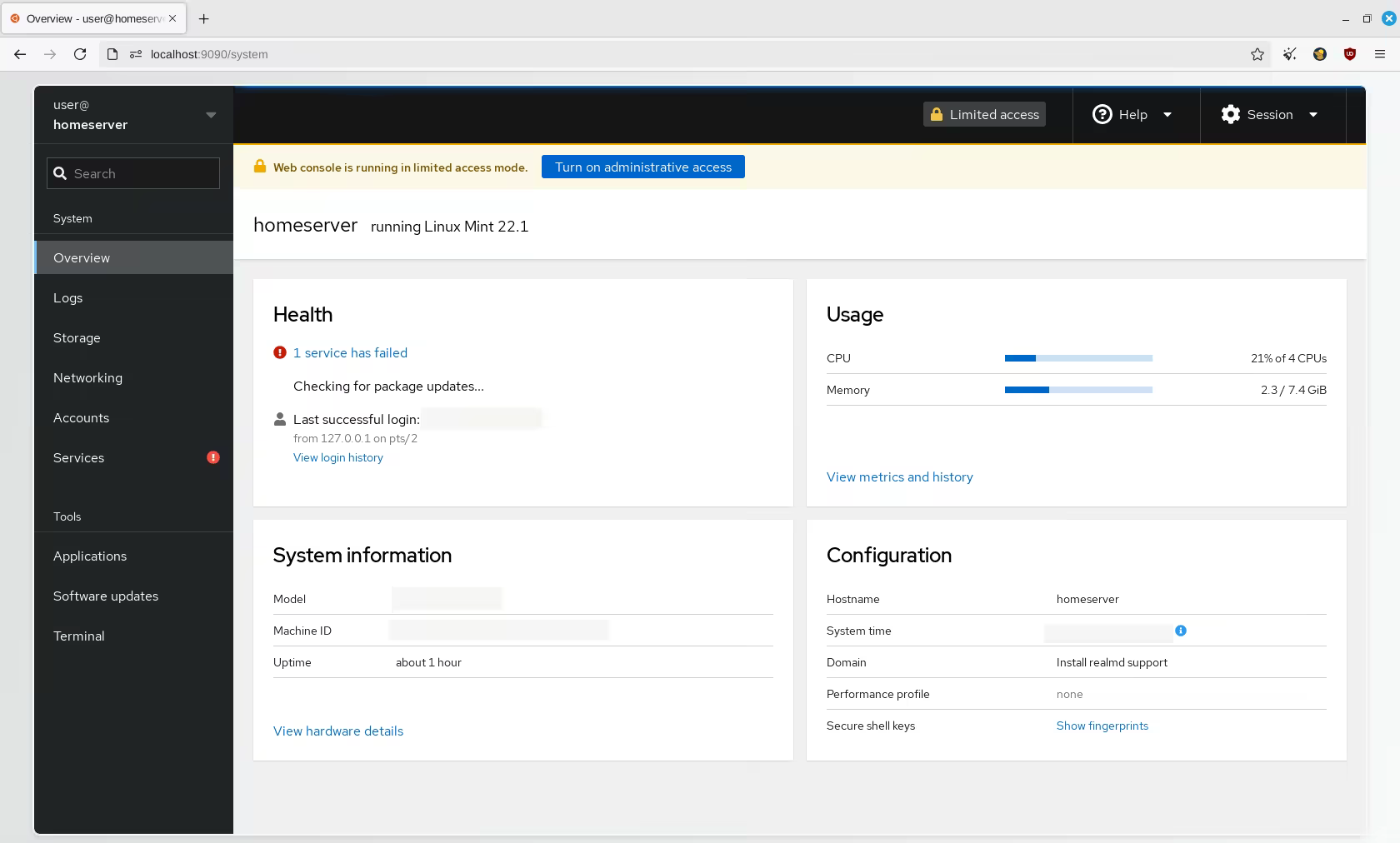 Once you install, open up a browser (not Tor Browser), and navigate to localhost:9090. You may get an HTTPS cert warning, just dismiss it. Then type in your Linux username and password. Here you can see me doing it in Mullvad Browser: