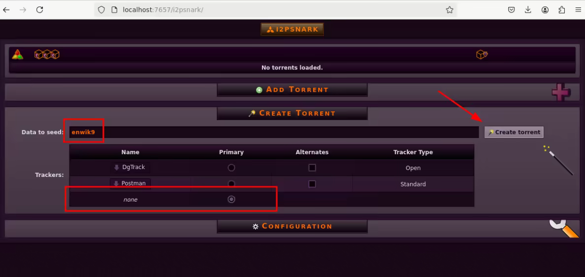 With I2P up and running, we can now configure the built-in torrent app called I2PSnark.