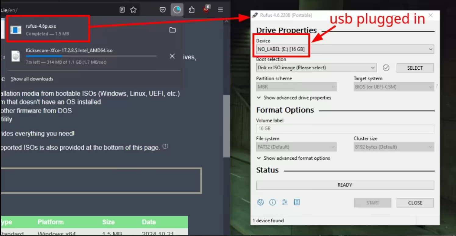 next we install Rufus and plug in a usb stick in the computer (Warning: the usb stick should be at least 2 GB big) :
