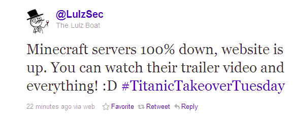 On June 14, 2011, following requests from their online community, the group temporarily took down several websites, including League of Legends, Minecraft, The Escapist, and FinFisher. The following day, they disrupted the login server of Heroes of Newerth.