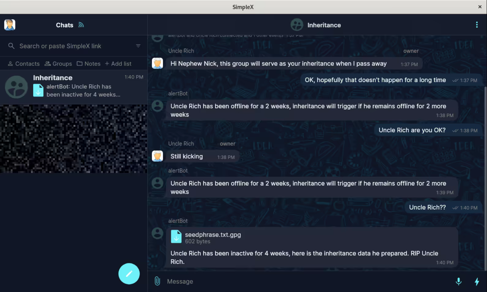 Uncle Rich starts off by PGP encrypting his Monero wallet seedphrase using Nephew Nick's public key and preparing the simplex-alerter. On a deniably rented VPS, Uncle rich sets up the simplex-alerter and invites Nephew Nick to the SimpleX chat. After some time passes, Nephew Nick checks in on Uncle Rich. If Uncle Rich is still alive, he will respond to Nephew Nick, resetting the 30 day countdown timer. If Uncle Rich is no longer with us, he will not be able to respond. As a result, after 30 days pass, Nephew Nick will receive the PGP encrypted message that Uncle Rich set up from the simplex-alerter bot.