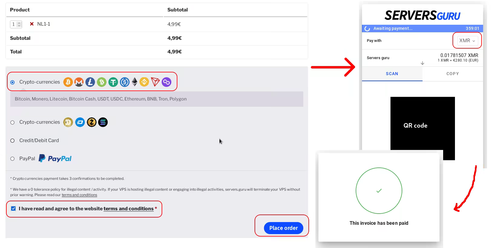 Servers.guru is the chosen provider in this example as they allow anonymous registartion using their onion address, accept Monero payments and have automatic monthly payment deductions. Uncle Rich is able to load a bunch of credit on his account to be automatically deducted thus not having to worry about interruptions to his service while he is nearing the end of his life.
