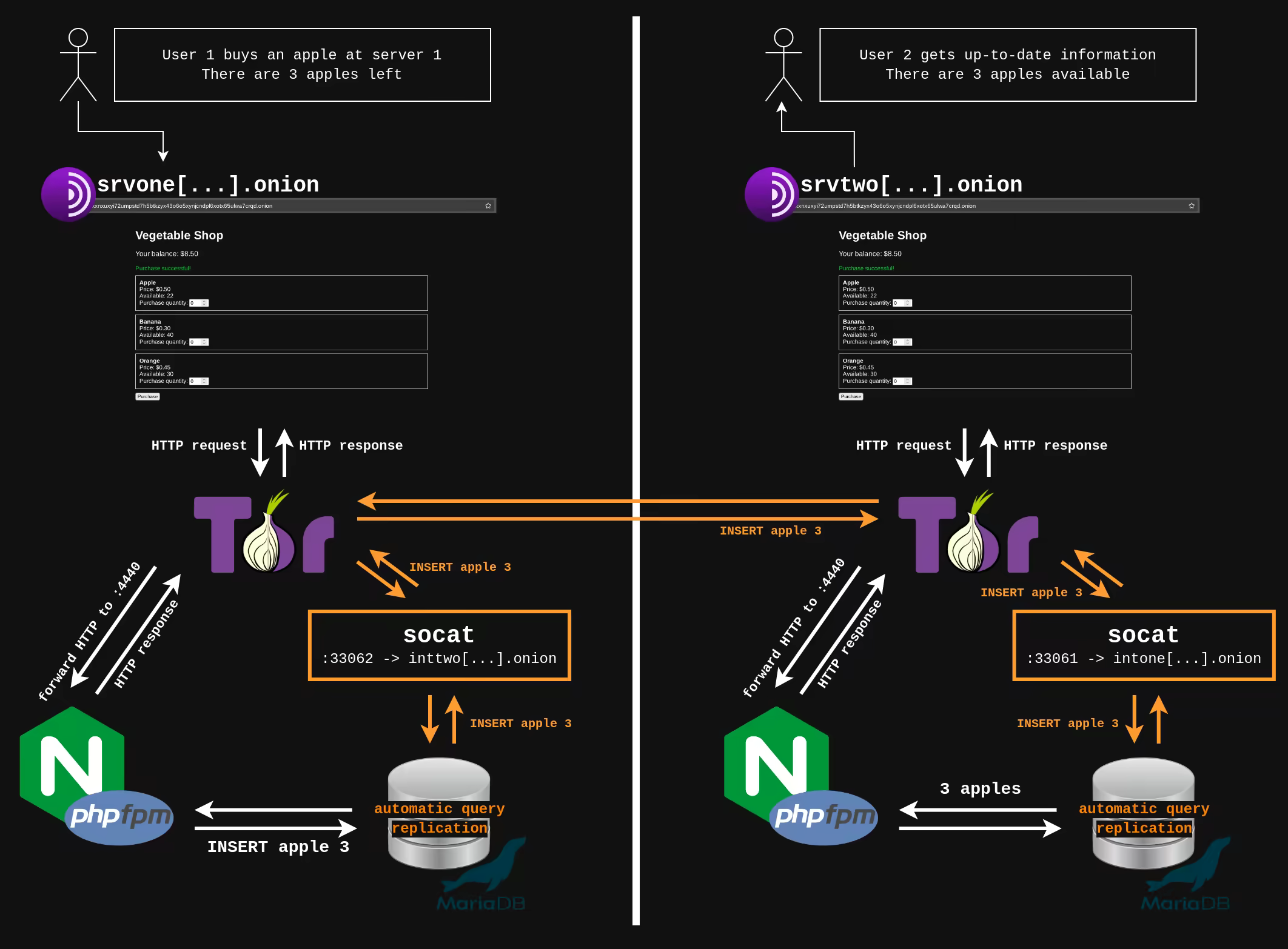 We will synchronize databases automatically between our two hidden services. If a user makes a purchase on one server, the second server will be notified immediately, executing the same SQL query on both databases. All communication between servers will occur over the Tor network, providing authentication and encryption without opening ports or generating SSL certificates.