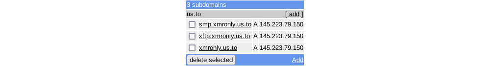 To start, we will need a domain name. A subdomain such as a free one obtained from https://freedns.afraid.org will also work. Create A record entries for smp.yourdomain.tld and xftp.yourdomain.tld and point them at the IP address of your VPS.