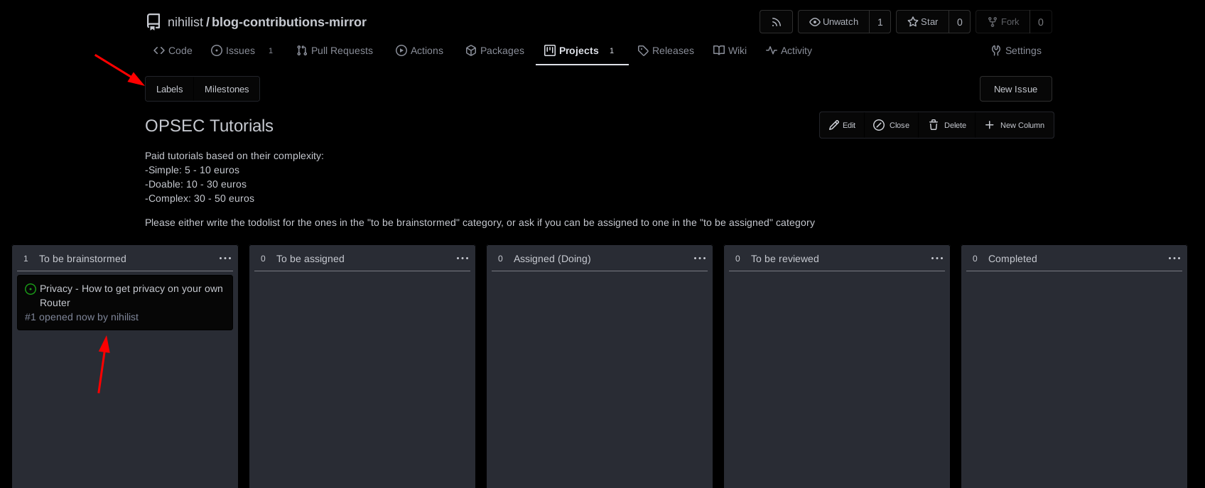 Here the workflow is preety straightforward, the first column is there for the tutorials that don't have the todolist written yet, the second column is for those that do but aren't assigned to someone yet, the third column is for the assigned tutorials (with a 1 month default deadline), the fourth column is for the maintainer to review what the contributor has sent, and the last column is for the tutorials that are completed: