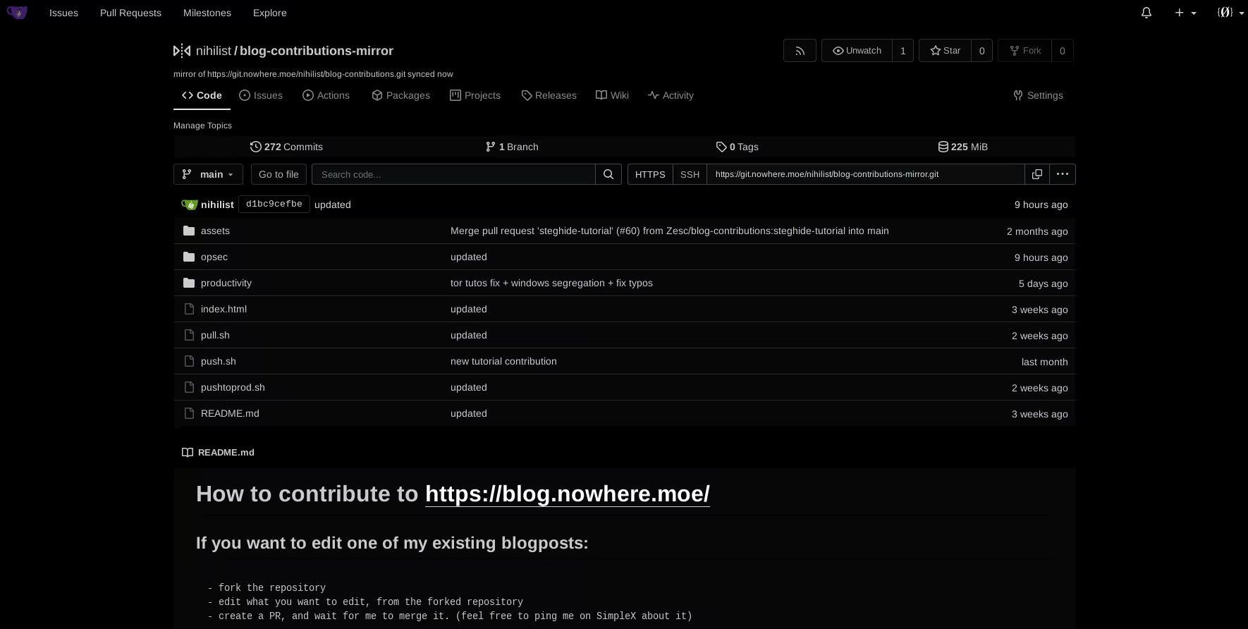 Now here you have a simple mirror git repo of the blog, once a day it will synchronize the new changes onto your mirror which is always useful to have in case if the main repository gets taken down.
