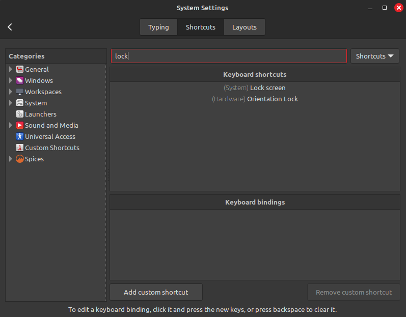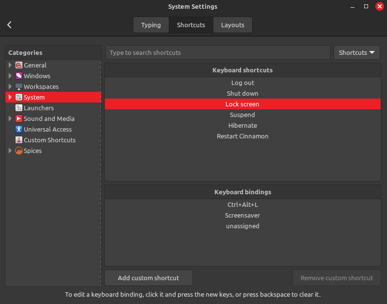 Here, you should find the shortcut dedicated to lock the screen. If not, or if the base shortcut does not fit to you, you can add one: