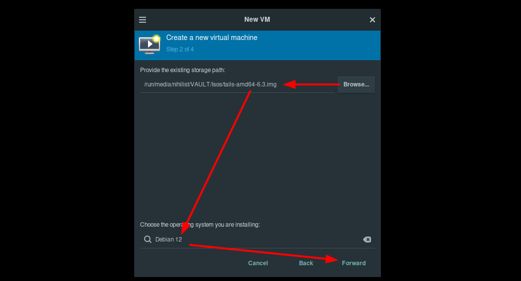 Now in the same way (even though it is a less-popular setup) we can also we can create a Tails OS QEMU VM in virt-manager like so: