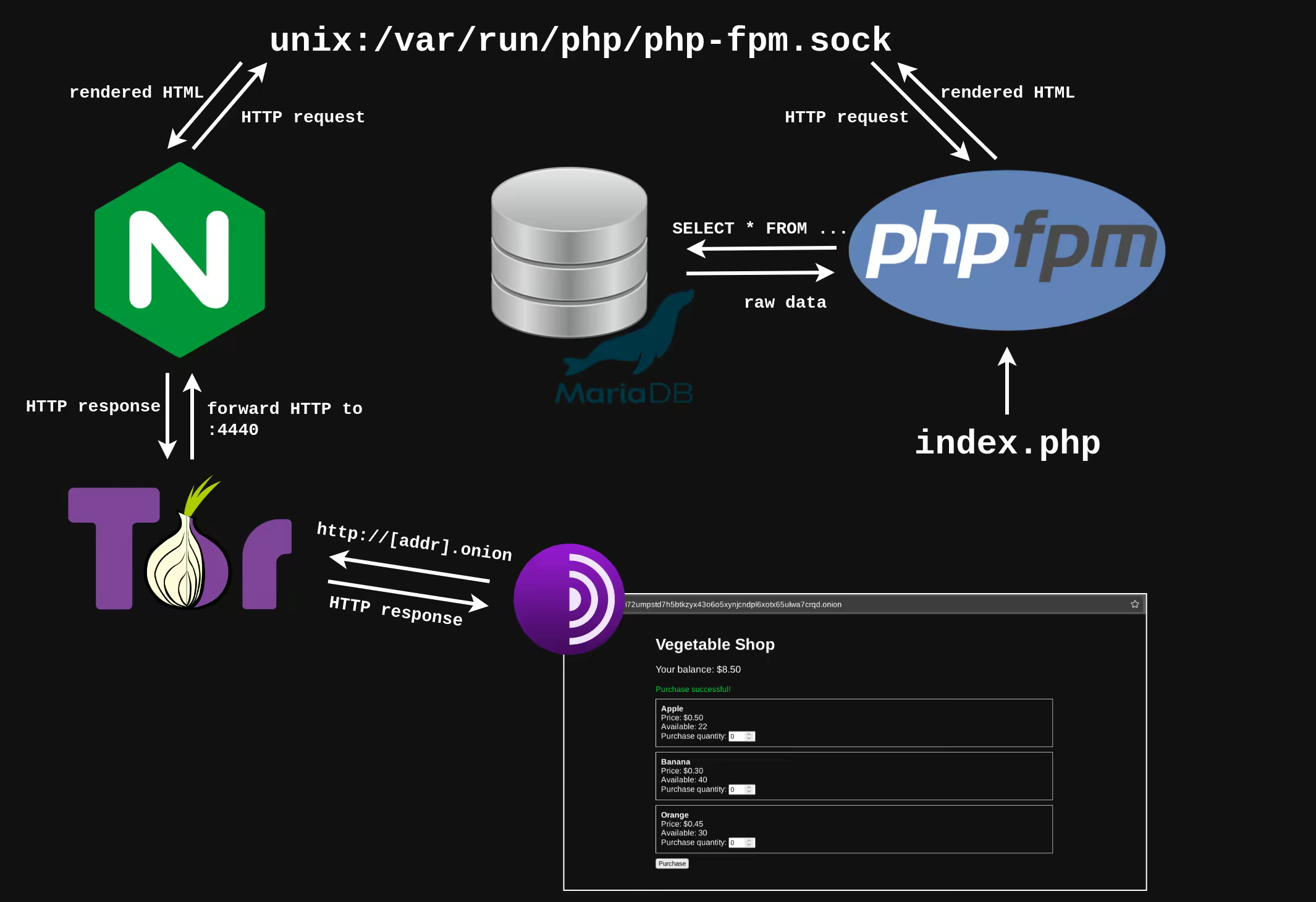 In this guide, we will set up a LEMP stack (L inux + E ngine-X + M ySQL + P HP) and expose a vegetable store website via a Tor hidden service. Nginx will act as a reverse proxy, passing requests to the PHP-FPM socket and returning an HTTP response back to the user. The PHP-FPM interpreter will execute the necessary PHP script to render the page and pass it to Nginx.