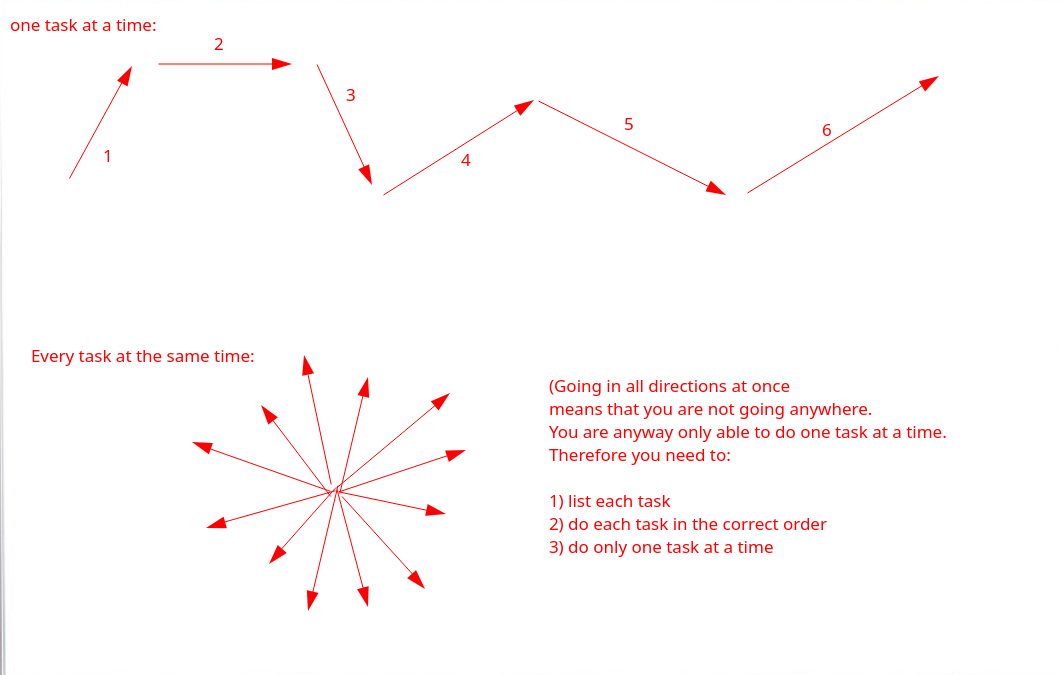 This is essential because you are only able to focus on one thing at a time. You anyway have to do one task at a time, that's why you need to list each task, make sure that you put an order to those tasks, and make sure that you only do one at a time.
